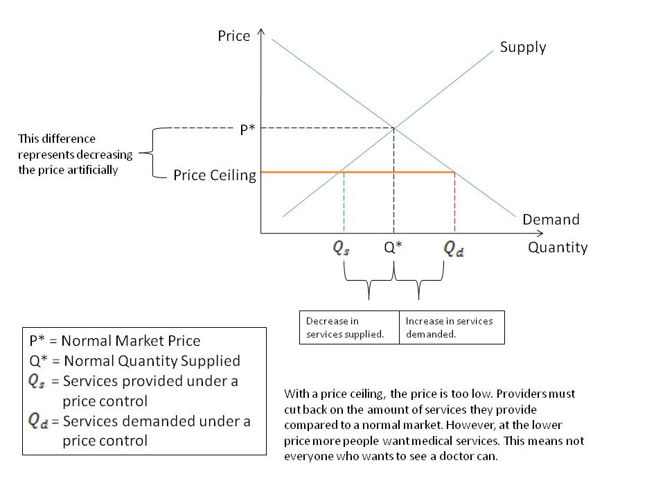 Currently, Medicare regularly cuts the amount it pays doctors for performing a service. Congress authorizes these cuts each year. One argument for not paying doctors is that it will shift costs to doctors who, we assume, “can afford it”. Yes, this does shifts the cost burden, but it comes with a tradeoff. This distorts the market, creating a price control. This kind of price control is called a price ceiling and inevitably leads to a shortage of medical care (click here for a very simple graphical analysis). However, if we stopped cutting doctor payments the price of healthcare would remain unchanged. But doctors would, to maximize profits, supply more healthcare to the market. Since more healthcare is available more consumers could access it, improving health outcomes and eliminating shortages.