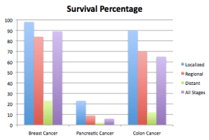 Depending on the aggressiveness, and location of certain cancers, the survival percentage can vary. However, there are consistent signs among breast, colon, and pancreatic cancer that shows distant (or overgrown) cancerous tumors are the most dangerous where regional (medium sized area) is less dangerous, and a localized case is the most hopeful. Reflected in the graph to the left, one can compare the corresponding cancers to their survival rates. Where breast cancer is 98% curable if localized, and colon is 90% when local, pancreatic cancer has a survival percentage of only 23%. The statistics only get worse, is the pancreatic cancer spreads regionally or to distant, the survival percentage goes from 23% to 9% and then 2%. Not to mention to current statistic for surviving pancreatic cancer patient to make it past 5 years after diagnosis is about 7-10%.