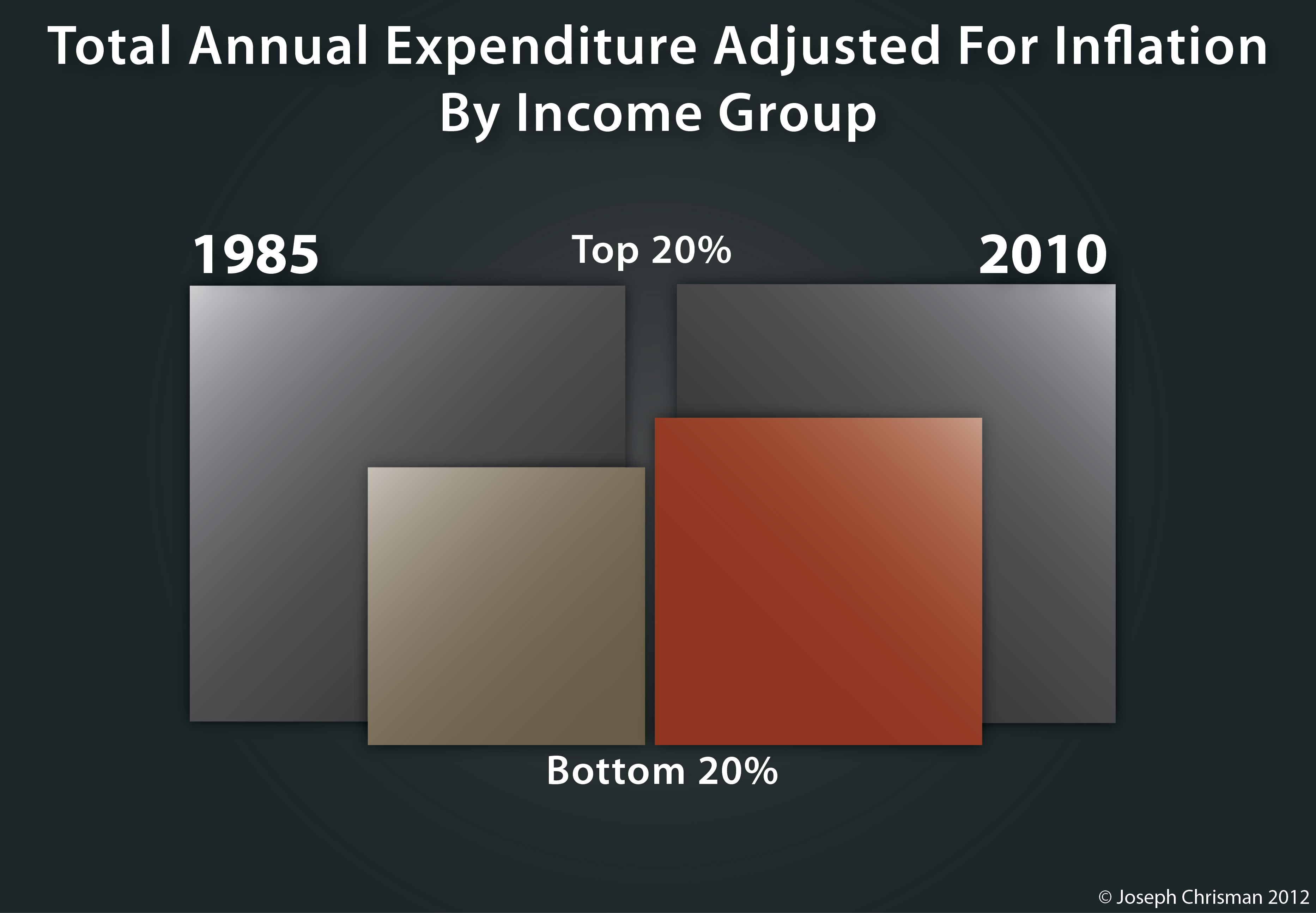 As you can see, the top 20% has seen a relatively small increase in expenditure from 1985-2010, the bottom 20% however has seen a significant increase in expenditure since 1985. In fact, in 1985 the top 20% had 2.47 times more expenditure than the bottom 20%, and in 2010 they had a lower 2.35 times more expenditure. This tells an interesting story because expenditure is determined by disposable income. Disposable income is after tax and after any income transfers, so it reflects the amount individuals can actually spend to pay for necessities and leisure activities.