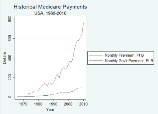 The blue line is how much enrollees are paying for Medicare part B each month – think of it as the marginal cost they feel for getting more care (monthly payments don’t do a great job of accurately conveying marginal cost, but under the current system, that’s what they pay for part B). The red line is how much the government pays for part B, per enrollee. The trend is not encouraging.