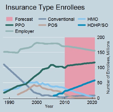My overly simple linear forecasts about insurance types predict that high deductible health plans with savings options will soon have more enrollees than any other type of insurance. Why? I assume that it is due to the perceived low probability of maxing out on deductibles combined with the desires to pay as little per month as possible and to have more control over where (and on what) to purchase medical care.