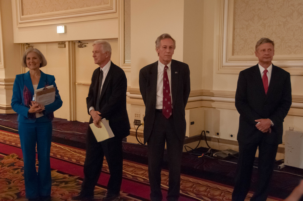 (From left) Third party presidential candidates Jill Stein (Green Party), Rocky Anderson (Justice Party), Virgil Goode (Constitution Party), and Gary Johnson (Libertarian Party) at the Third Party Debate Tuesday night.