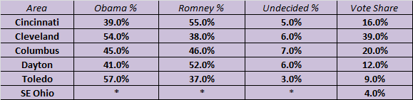 SurveyUSA found Obama leading Romney in Ohio 48%-45%. It divides Ohio into six different geographic areas: Cleveland, Columbus, Cincinnati, Dayton, Toledo and Southeast Ohio. Here is their data.