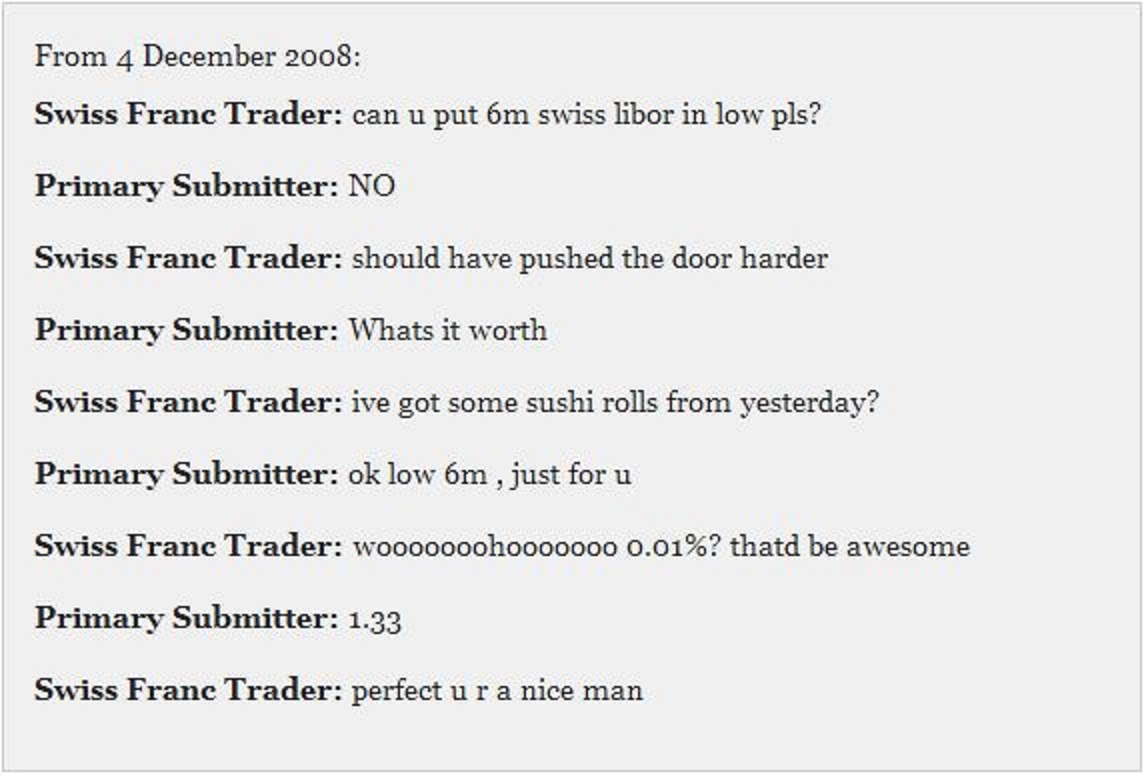The above conversation, one of dozens of similar communications, is representative of the blatant manipulation banks were involved in, and in case you missed it, this conversation consisted of a bank employee agreeing to falsify Libor numbers in exchange for day old sushi – one of hundreds of falsifications that resulted in over $10 billion in losses for U.S. cities and towns alone. It is unlikely that we will ever know the full extent of losses to investment funds, pensions, retirement accounts, or individual investors, but they probably total in the tens (if not hundreds) of billions.