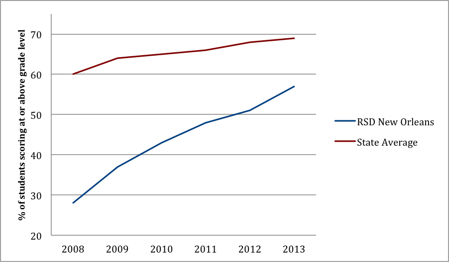 According to state data, the percentage of students from RSD schools scoring at grade level or above on standardized tests increased by 29% between 2008 and 2013. The performance of New Orleans students is improving faster than that of Louisiana students as a whole. Louisiana students scoring at grade level increased by only 9% between 2008 and 2013.