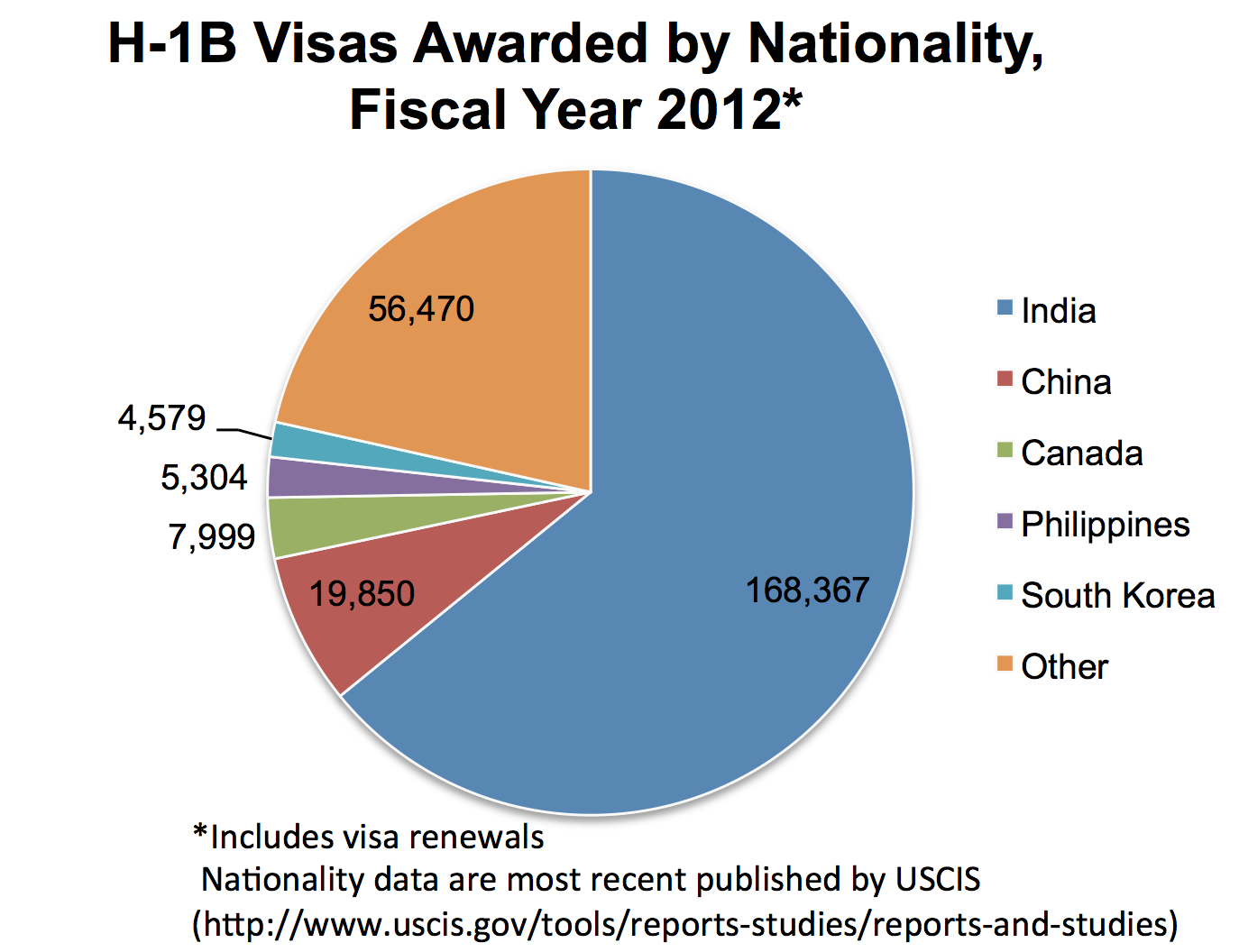 As border security fear mongering steals the headlines (first ISIS, now Ebola), a slow-burning immigration drama is playing out between the world’s two biggest democracies. The controversy revolves around the H-1B visa, a 3-year nonimmigrant visa designed to attract skilled foreigners to fill U.S. labor shortages in the science, technology, engineering, and mathematics (STEM) fields. Since the program’s inception in 1990, Indian nationals have quickly established themselves as the leading H-1B recipients, obtaining 64 percent of the visas in 2012. Considering U.S. Citizenship and Immigration Services (USCIS) met the annual H-1B cap of 65,000 within a week for the past two years, the dominance of a single applicant pool merits further scrutiny.