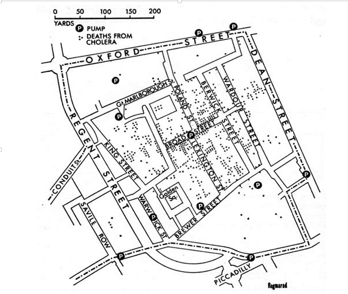 John Snow is viewed by many as a pioneer in disease mapping. He was a founding member of the London Epidemiological Society, one of the first professional organizations devoted to the field of epidemiology. For the 1854 cholera outbreak in London’s Broad Street region, he presented a map of disease outbreaks around the Broad Street Pump to the Board of Guardians of St. James’ parish, the fundamental tier of local government that was in service. In consequence of what he said and the evidence that he presented, the handle of the pump was removed on the following day. Contemporary epidemiologists view removing the pump handle as appropriate and honor Snow’s action to safeguard the public, even in the face of biological and epidemiological uncertainty. Not surprisingly, the number of people infected with cholera dropped.