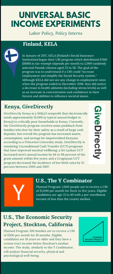 In December 2018, Finland’s Social Insurance Institution, KELA, terminated their two-year Universal Basic Income (UBI) experiment that aimed to “increase employment and simplify the Social Security system” citing insignificant changes in the employment rate of participants. Despite this outcome, prominent U.S. figures–such as Elon Musk and Mark Zuckerberg– and the California Democratic Party still advocate for UBIs. One proponent, Andrew Yang, is even seeking a 2020 Democratic nomination on the platform that every American aged 18 to 64 should receive a monthly check for $1,000.