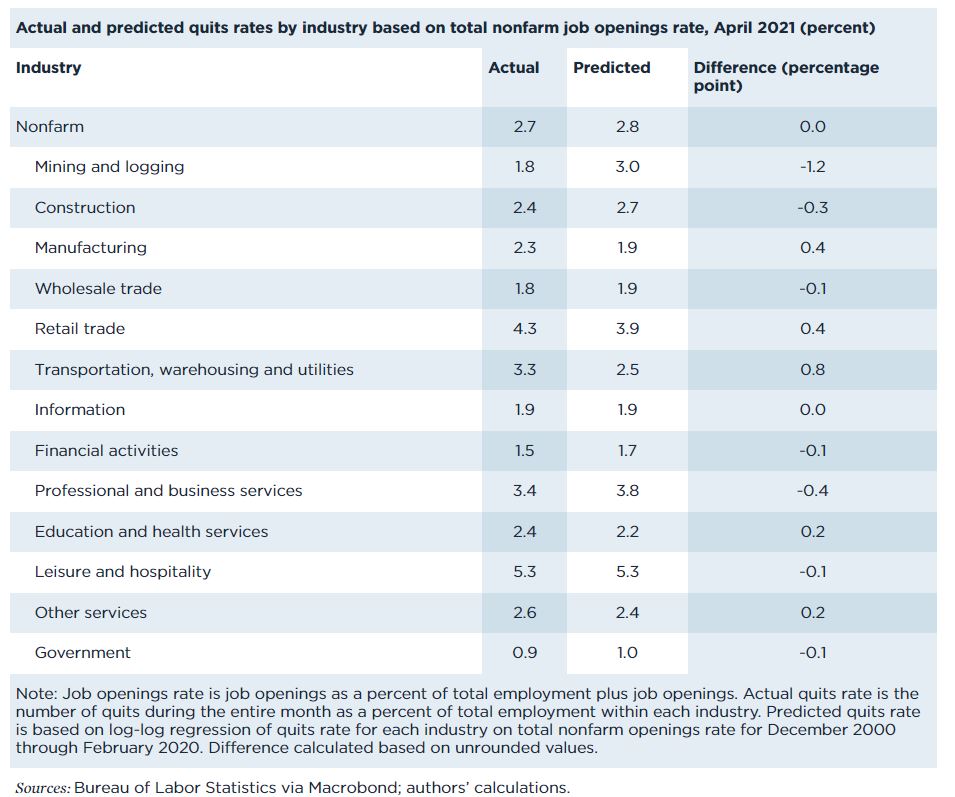 According to a recent analysis by the Peterson Institute for International Economics, the all-time high quit rate in April is not surprising given the unprecedented number of job openings. In fact, considering the historical relationship between the number of job openings and the quit rate, April’s record-high mark is almost exactly what would have been predicted. However, the researchers also performed industry-by-industry predictions for quit rates, and compared them to the real levels. Almost all industry-level predictions mirrored the real rate, with a glaring exception: retail trade. The authors’ model predicted a quit rate of only 3.9, whereas the real quit rate was 4.3 (the only larger difference came from the transportation, warehousing, and utilities sector, with a difference of 0.8). And although the researchers accurately predicted the quit rate in the leisure and hospitality industry, most recent measures remain extremely high, at a rate of 5.3 percent.