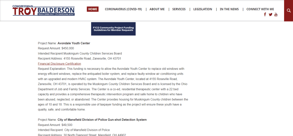 In bringing back earmarks, Rep. DeLauro, Sen. Leahy, and congressional leadership have promised an extra level of transparency. Each member is required to post their earmarks, now termed “community spending requests,” on their official websites, and the full text of the act is available at the webpage of the House. However, these postings only give the illusion of transparency and prevent anyone from easily gaining a big-picture look at the scope of the spending. For example, while information has been posted to each member’s website, the formatting is not universal. This might not be a problem if one only intends to research the earmarks requested by one member, but becomes an issue if one intends to compare the earmarks of two or more members. Below are the randomly chosen webpages of Rep. Troy Balderson (R-OH-12) and Rep. Nydia Velázquez (D-NY-07) as examples: