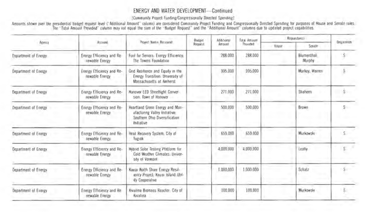 Luckily, the full list of earmarks is available in the online copy of the Appropriations Act. The act follows a mostly uniform format and is put in an organized chart. Unfortunately, it has been uploaded in the most user-unfriendly way possible: a blurry, misaligned, xeroxed PDF. Here is a screenshot of one of the tables from Division D of the Appropriations Act: