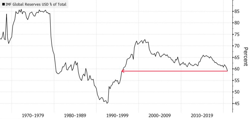 Since the conclusion of World War II, USD has remained the world’s dominant reserve currency. USD’s status as the standard foreign reserve currency gives the United States economic advantages in both borrowing and lending. Its status also gives the United States a massive geopolitical advantage through the ability to enforce sanctions on specific parties by restricting transactions with the dollar. Throughout the 1970s, USD was more than 80% of the world’s reserve currency but dipped to under 50% by the end of the 1980s due to the energy crisis and stagflation. Despite the crash, the USD recovered to over 70% of the world’s reserve currency by the turn of the century. Since then, USD has slowly decreased throughout the 21st century and accounted for just 58.36% of foreign reserves in 2022.