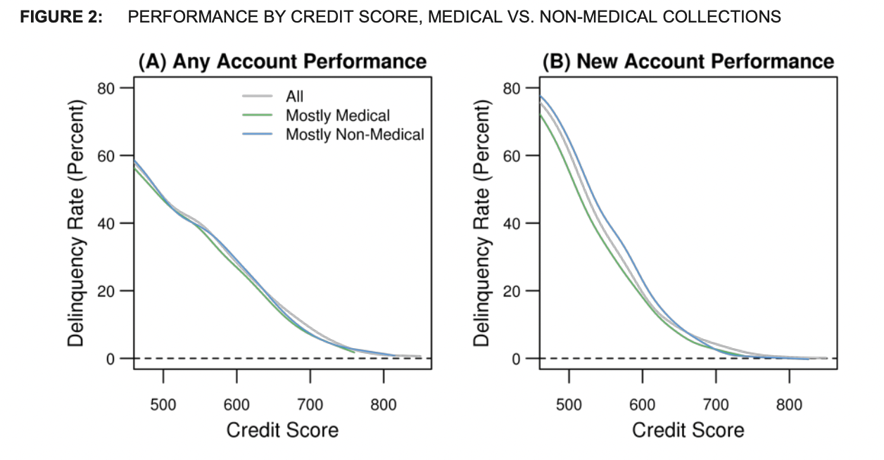 The CFPB, under the leadership of former agency Director Rohit Chopra, cited research that shows “…medical debt has limited predictive value in predicting future default…[and] may be less predictive of whether a consumer will pay a future loan…,” which helped inform the agency’s new rule. A study from the Consumer Financial Protection Bureau’s Office of Research from 2014 showed that delinquency rates for individuals with ‘mostly medical collections’ were only marginally lower than individuals with ‘mostly non-medical collections’ with the same credit score; suggesting, the two groups are “not equally predictive of delinquency.”