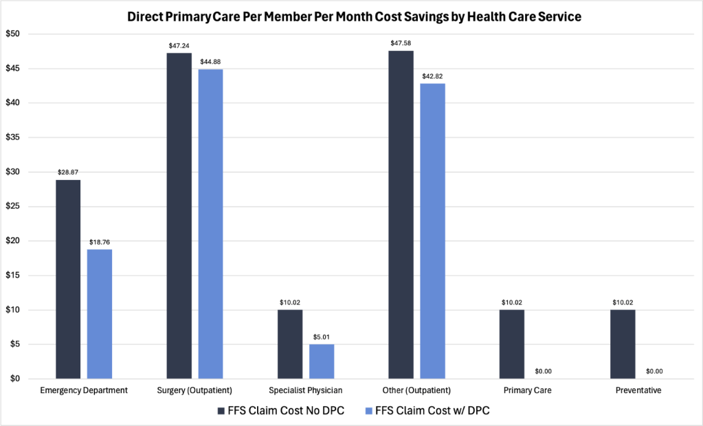 Some direct primary care practices offer contracts for patients directly through their employers, which has demonstrated significant savings when combined with traditional insurance. A case study of a firm that introduced a DPC option for their employee’s health benefit plans, found that there was a significant reduction in total health care claim costs for the firm (see chart below). The savings were in large part due to their employees with DPC memberships having lower emergency and inpatient care utilization. Importantly, the study noted that the introduction of a DPC option increased non-administrative plan cost, however, this was likely the result of other plan changes.