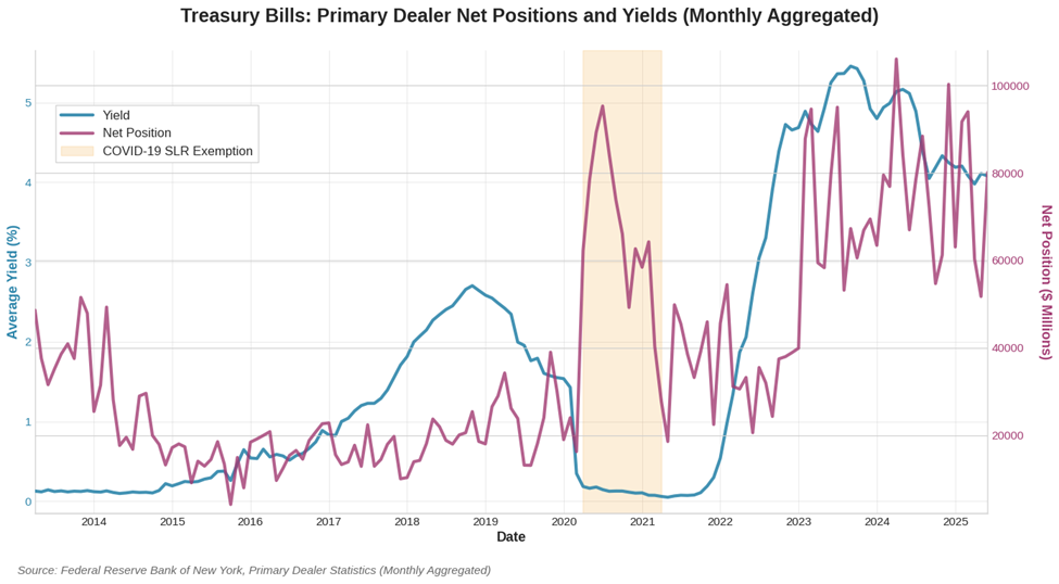 Consequently, much of the literature explicitly cited by these regulatory agencies focuses conclusions on evidence from a similar ruling during COVID-19, though this analysis has limitations. During COVID-19, the Fed decided to exempt Treasury securities from the denominator of leverage ratios. Although this closely matches the intention of the current rulemaking, the exemption was implemented during one of the most volatile market instances in history. Figure 2 plots both the primary dealer net positions (e.g., Treasury securities, bills in this case, held by banks) and yields for the respective maturity. This chart shows how much Treasury debt banks were holding over time alongside the interest rates those securities were paying.