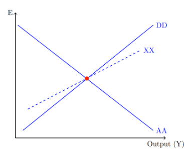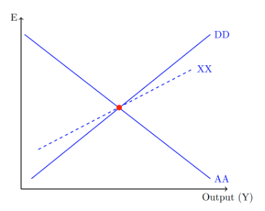 Several useful equations for the model and a graphical representation are shown below. The graph below also shows a dotted line for the XX curve. The XX curve is used to show the current account balance directly; any point above the curve represents a surplus while any point below represents a deficit. Any point on the line represents a current account of 0, indicating that imports equal exports.