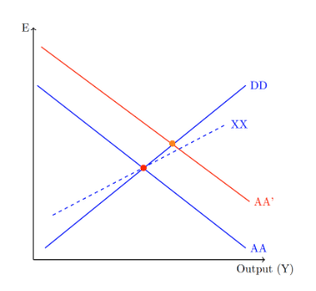 From the graph above, it is clear that the model predicts that a permanent increase in monetary supply increases the current account surplus in the short term as the orange equilibrium point is above the XX line. In the long term, the model predicts that the DD and XX curves will both shift upwards, returning the economy to equilibrium both in terms of output and current account, though the exchange rate will remain impacted.