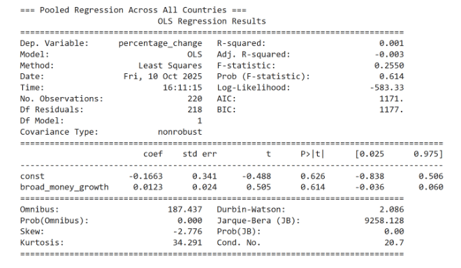 The pooled regression for a one-year lag gives B1 as -0.0252. This means that for every 1% increase in broad money growth, there was a 0.0252% decrease in current account as a percentage of GDP. With a calculated p-value of 0.381, this finding is still quite statistically insignificant.