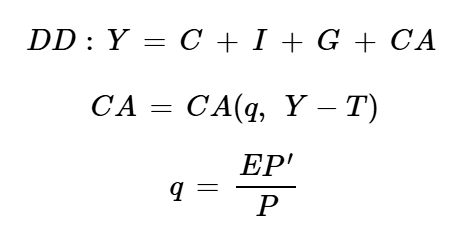 The model defines the DD curve as the goods market, with output defined as a function of consumption, C, investment, I, government spending, G, and the current account, CA. It further defines the current account as a function of relative prices, q, and disposable income, Y-T, where Y is output and T is tax level. Note that relative price is defined to be the exchange rate, E, times the ratio between foreign price level P’ and home price level P. When the exchange rate E increases, relative price q also increases. This means that it is relatively more expensive for the home country to import foreign goods, meaning imports fall, and it is cheaper for foreign countries to import the home country’s goods, meaning exports rise. As the current account is defined as exports minus imports, this means the current account increases, thus increasing output. Thus, the DD curve displays a positive relationship between E and Y.