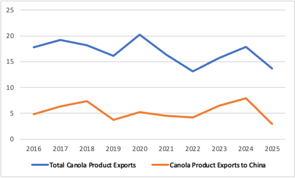 China opened its oilseed markets to outside supply in 1994, which triggered the rise of Canadian canola exports. According to the Canola Council of Canada, 90 percent of the canola produced in Canada is consumed abroad, and 44 percent of canola product exports in 2024 went to China. This represented $3.6 billion relative to the $32 billion in canola-derived Canadian economic activity that year.