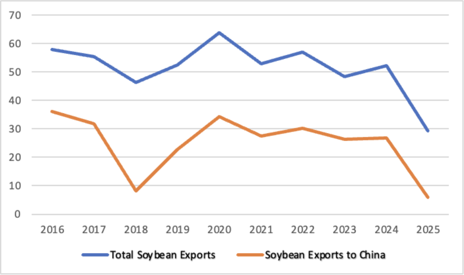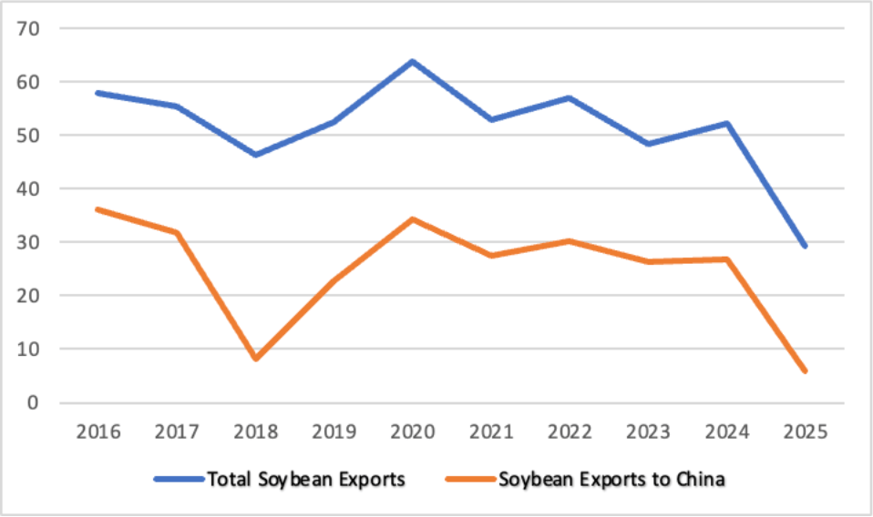 Figure 2: American Soybean Exports Total (MMTs), to China (2016-2025)